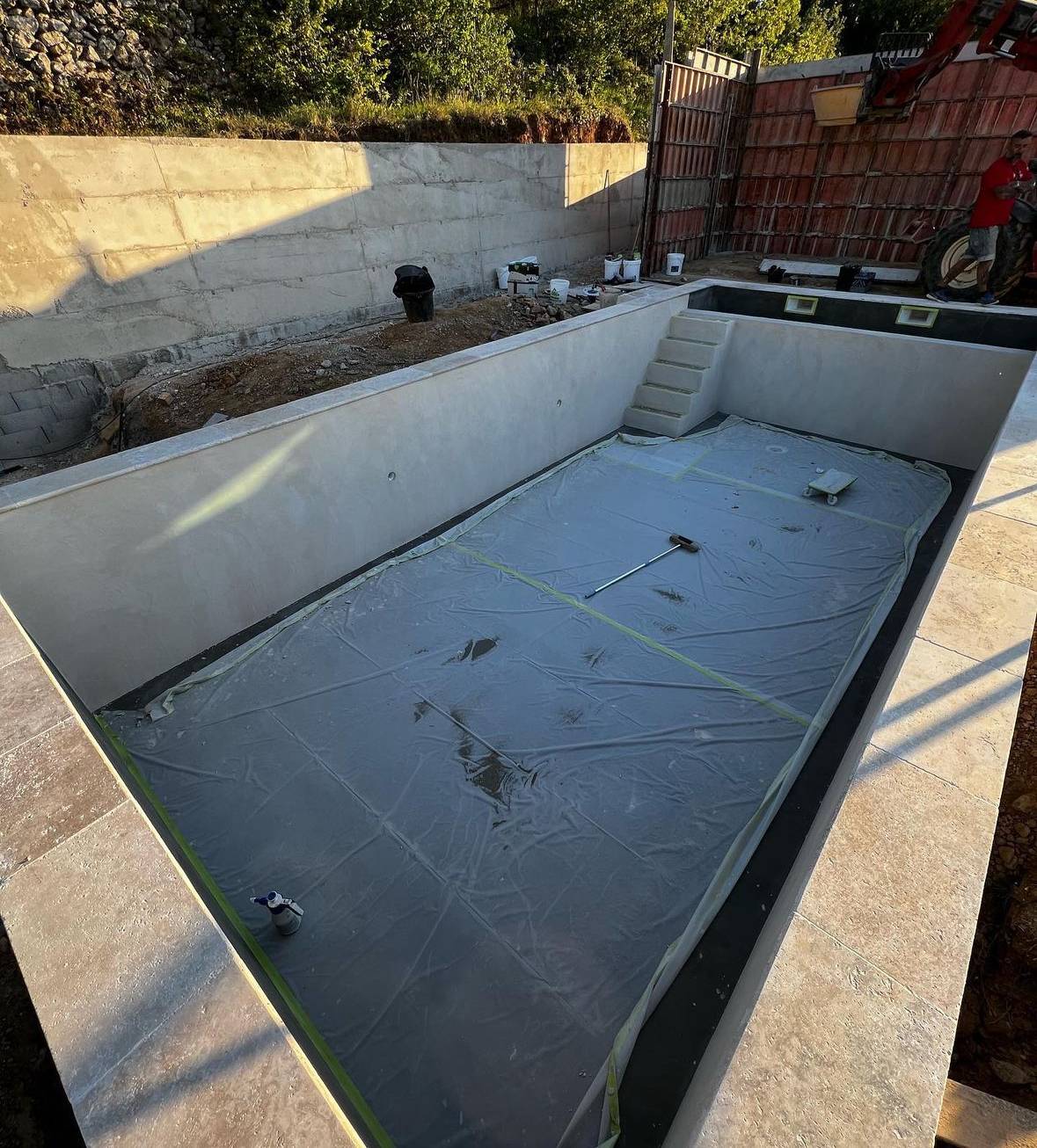 Béton Ciré Piscine a été minutieusement appliqué dans une piscine en construction dans le pittoresque village de Rians, niché dans le Var. L'élégant choix de la couleur beige pour le revêtement confère à l'eau une teinte verte claire qui épouse parfaitement l'environnement naturel environnant. L'harmonie du revêtement en béton ciré de la piscine crée une ambiance sophistiquée et élégante, mettant en valeur le caractère unique de cet espace aquatique.