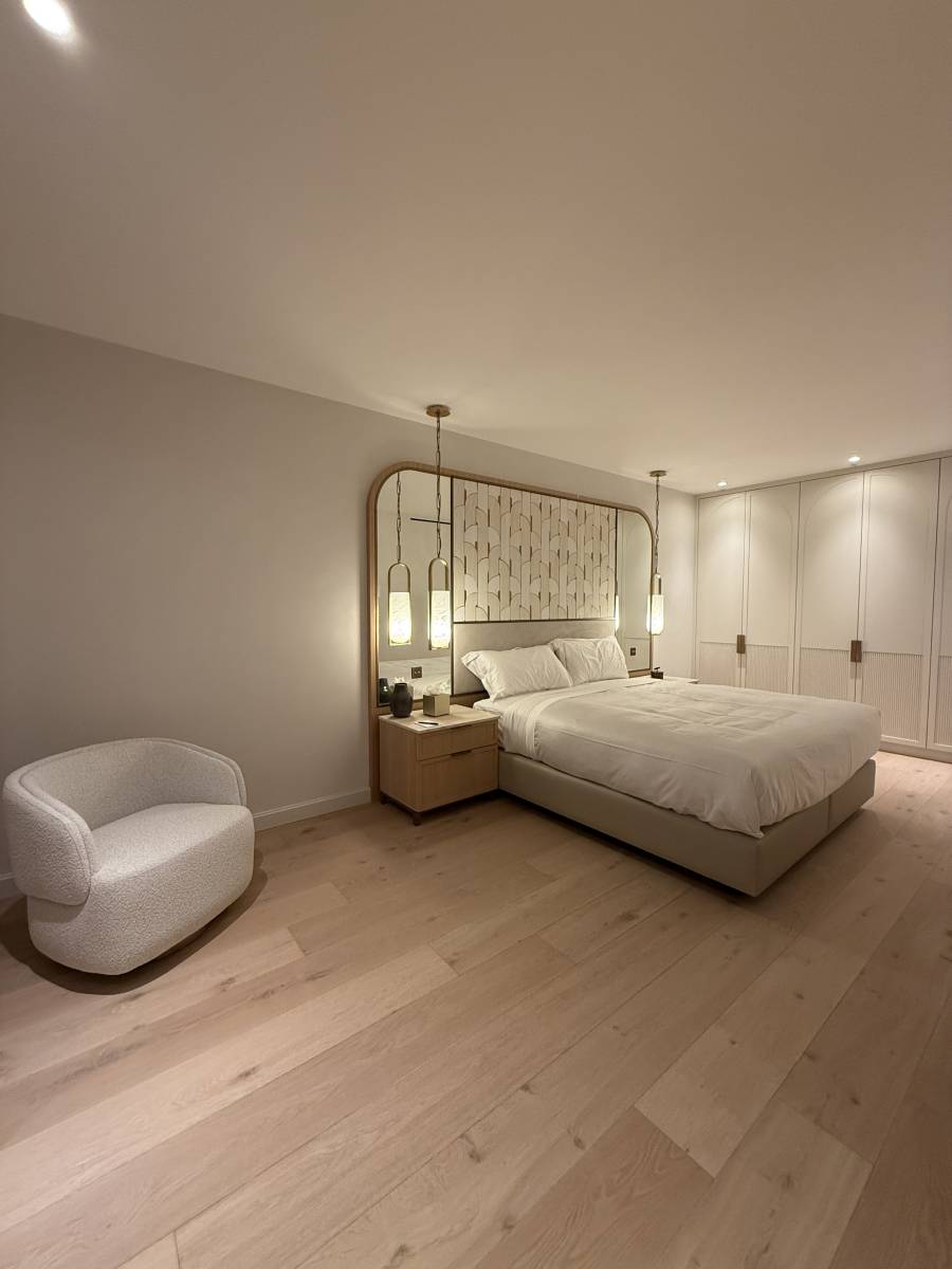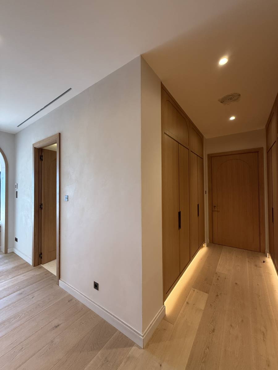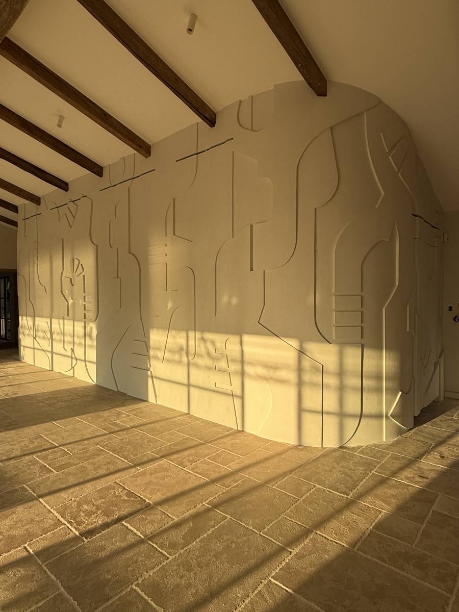 Un mur décoratif en staff a été réalisé puis recouvert avec précision de notre enduit minéral 000, structure l’espace et lui insuffle une identité forte, graphique et contemporaine. Les jeux d’ombres, les lignes sculptées et la douceur minérale créent un dialogue naturel entre l’artisanat, l’architecture et le confort.