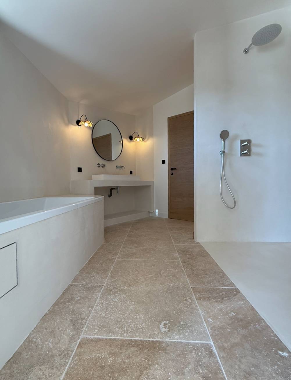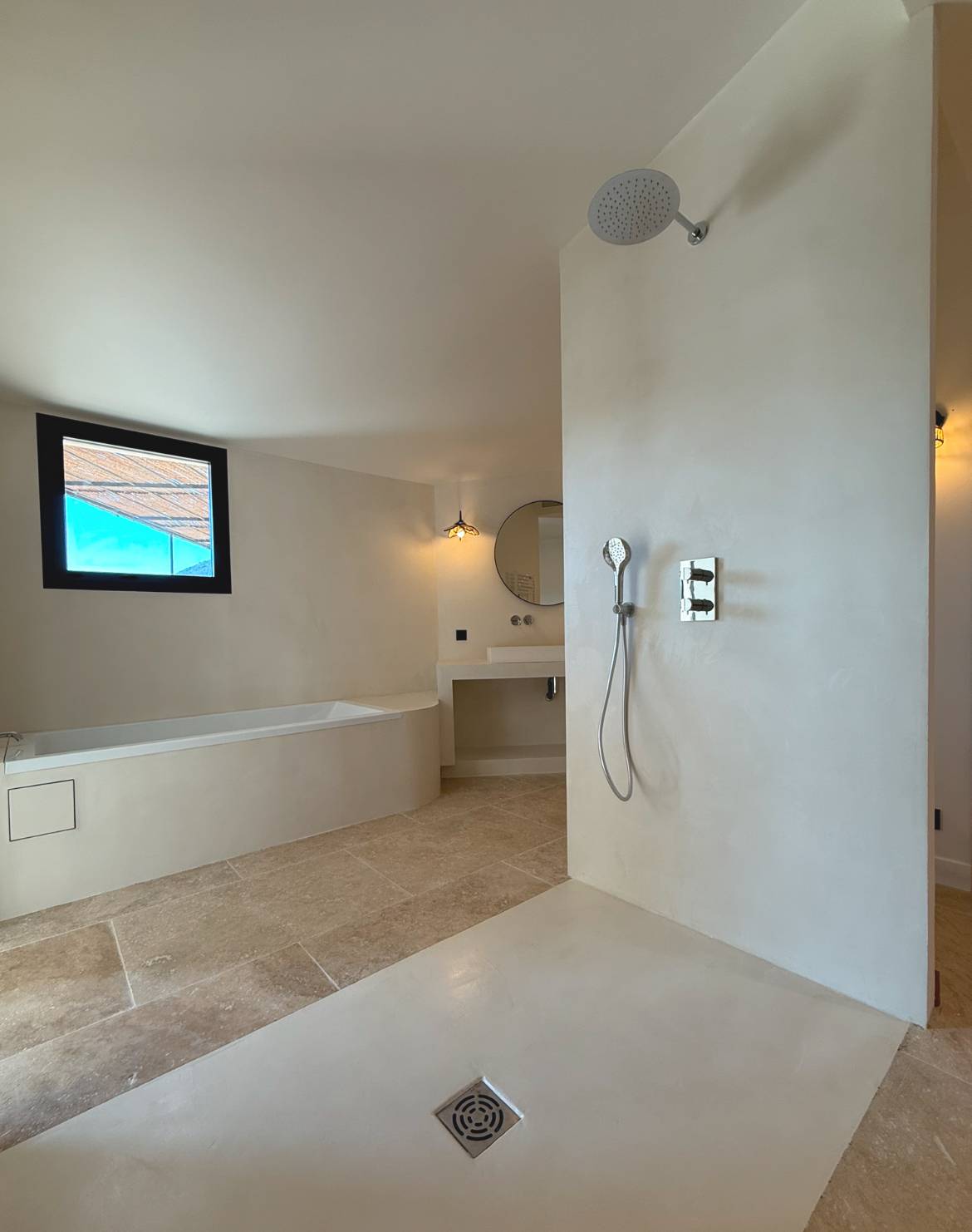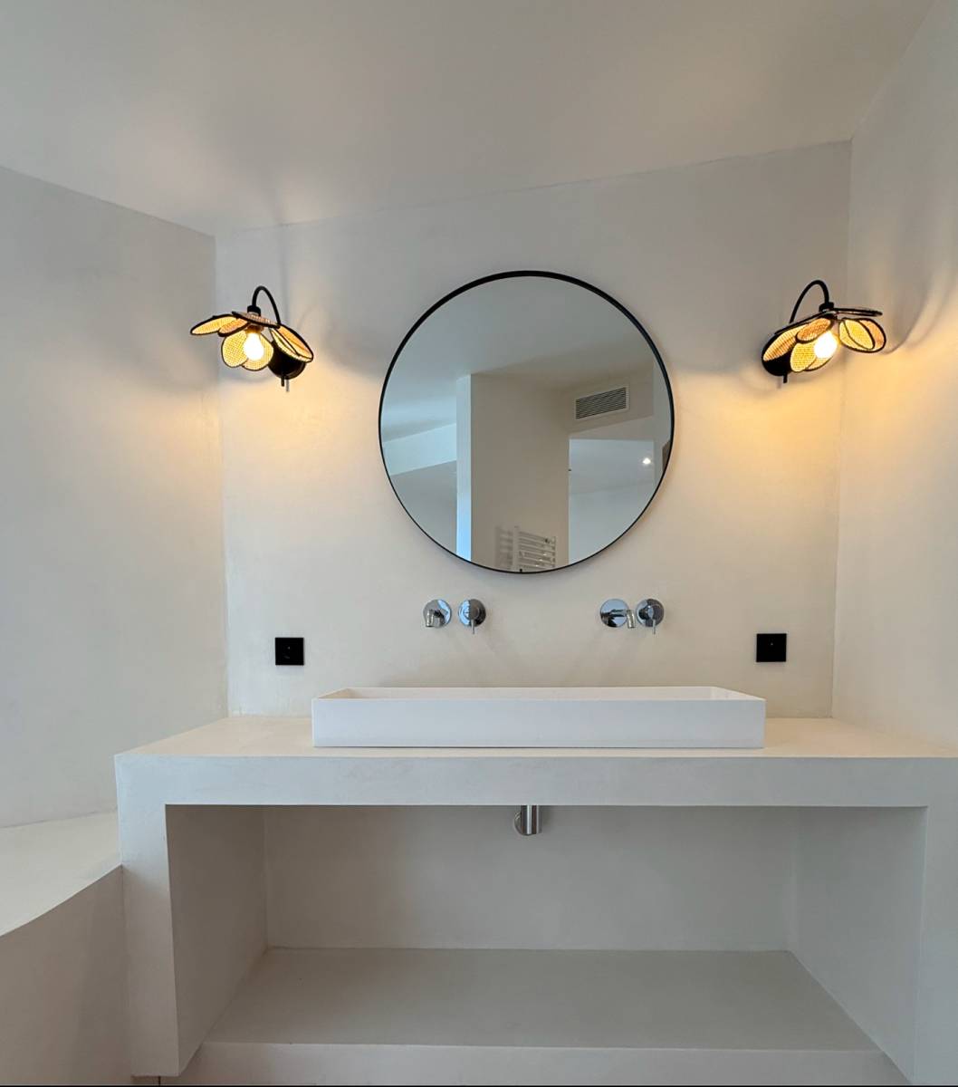 Pose d’un Béton Ciré de la marque intuition Beton couleur les lices Sur du Placo pour les murs et du carrelage pour le bac de douche qui ont été conçus en wedi. Cette magnifique, réalisation de Béton Ciré, spatules a été faite dans une magnifique villa dans les hauteurs de Cavalaire