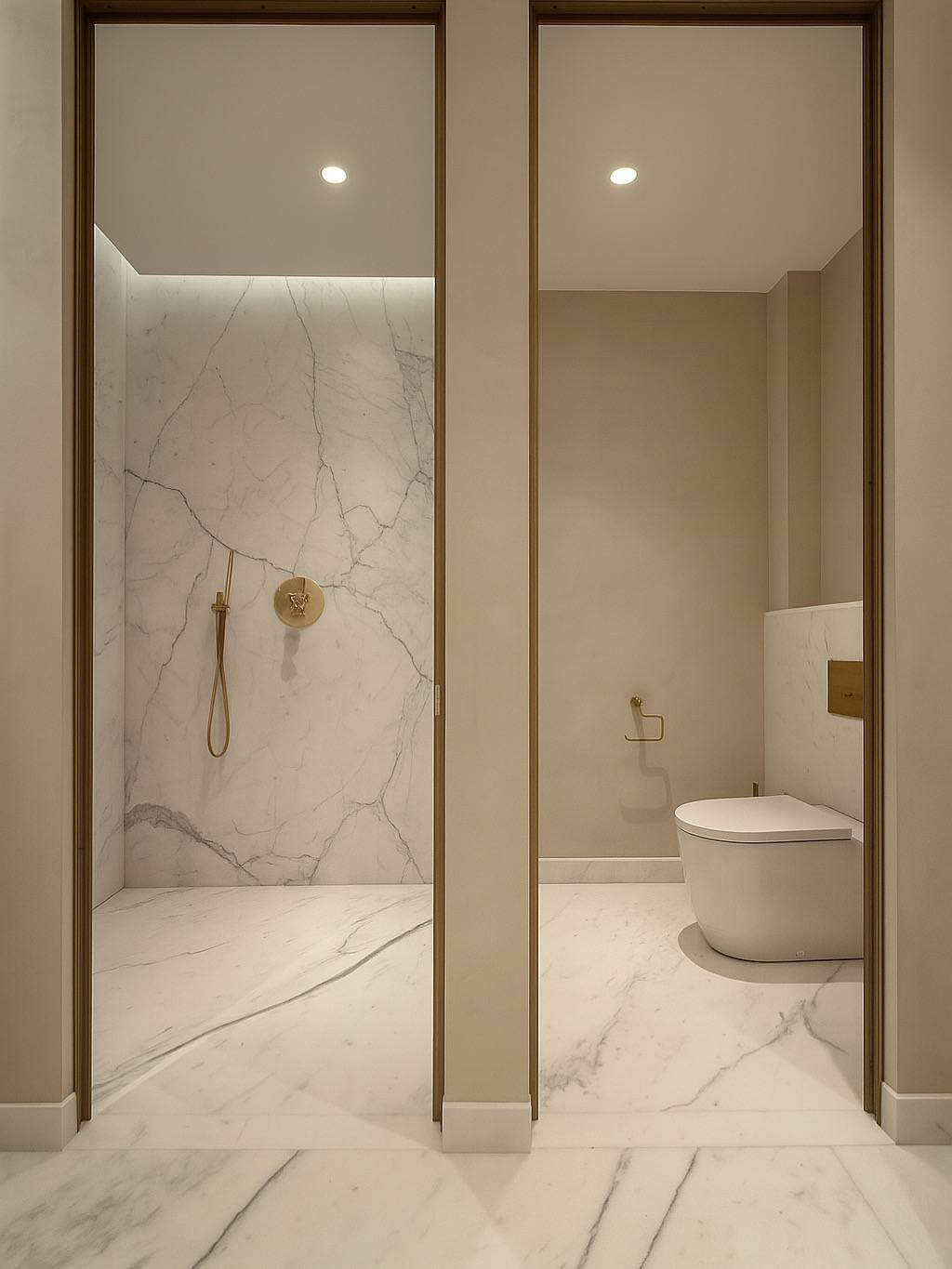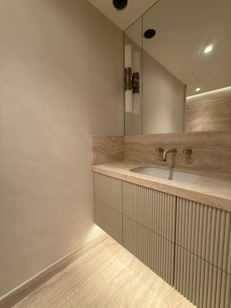 Dans cette villa contemporaine située dans le Golfe de Saint-Tropez, huit salles de bains, huit toilettes, un hammam et une salle de massage ont été réalisés avec le Béton Ciré minéral teinte M09 de la marque Intuition Béton.