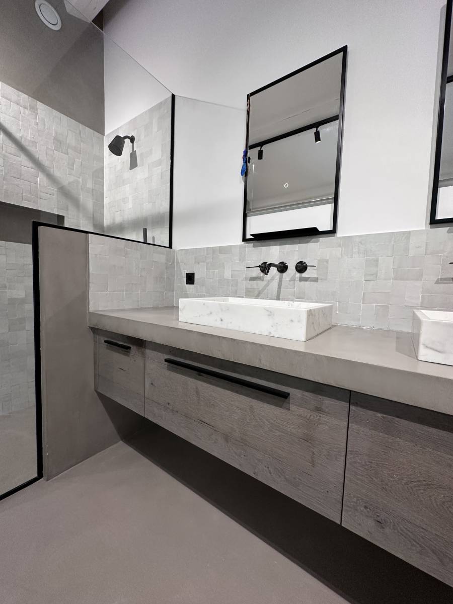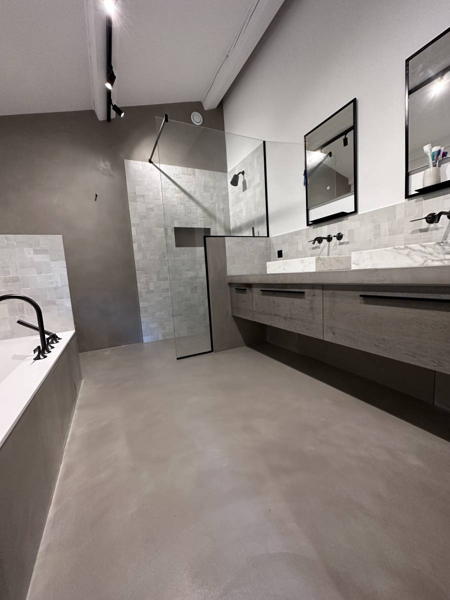 Décor Régence a réalisé l'application du béton ciré aux murs et au sol, la création d'un plan vasque et des parois de douches.
