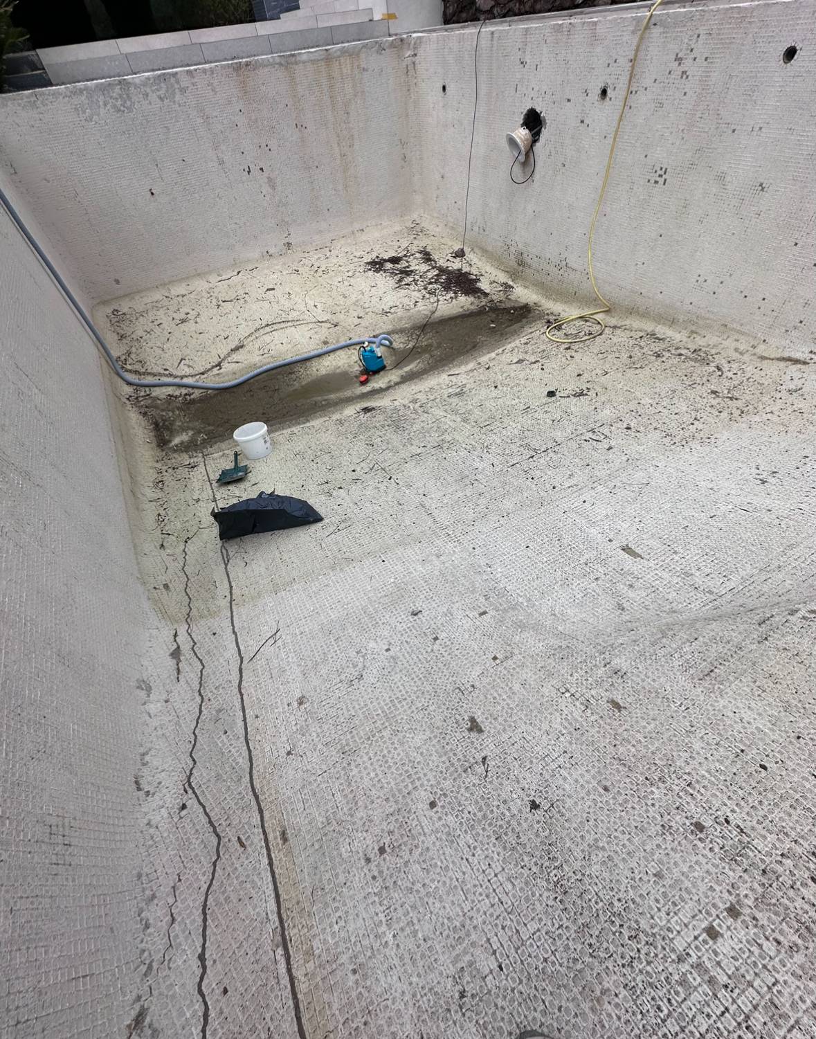 Après la dépose de la mosaïque, nous avons effectué un surfaçage sur l'ensemble de la zone de travail. Par la suite, l'application d'un revêtement de cuvelage d'étanchéité.